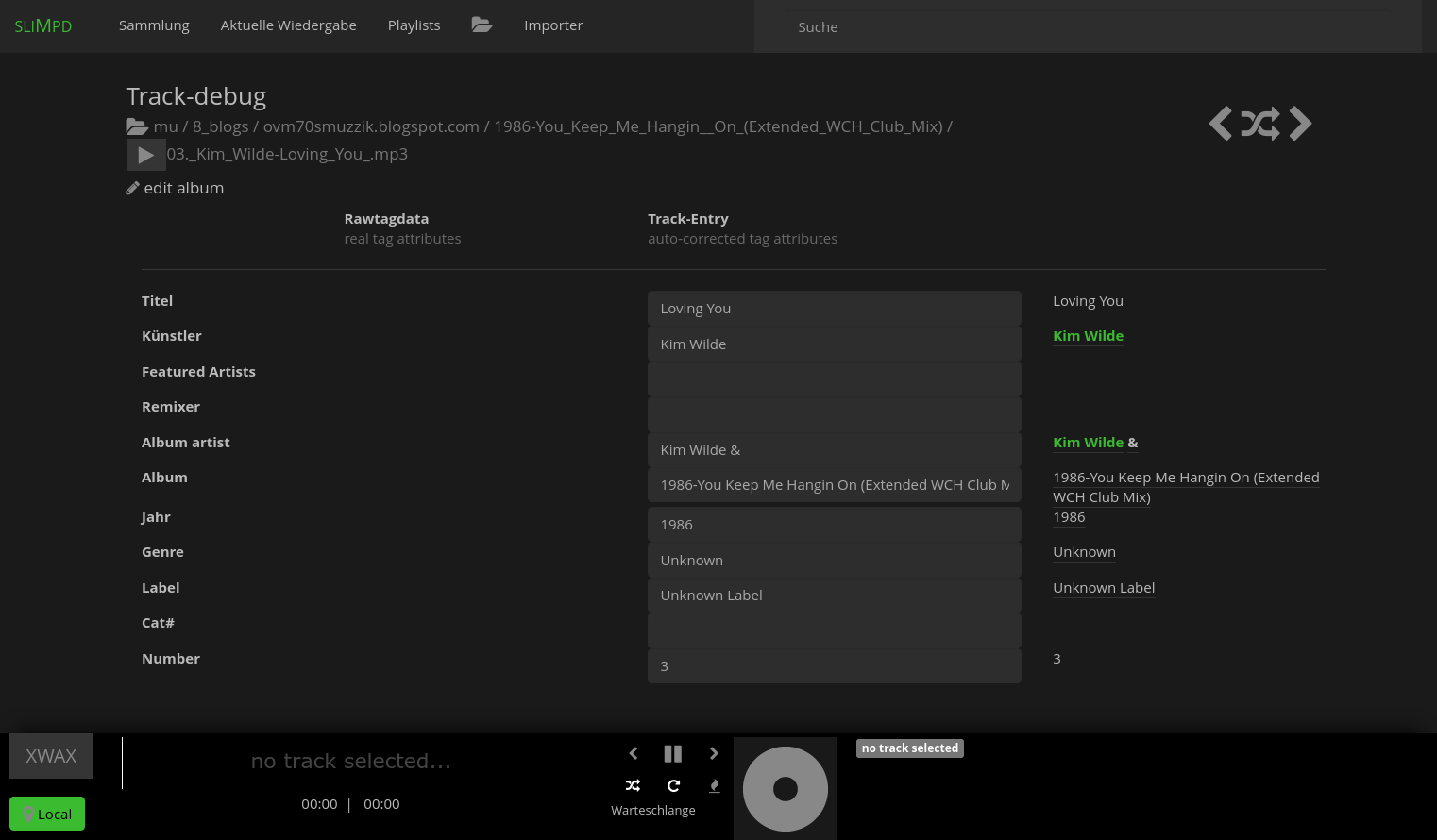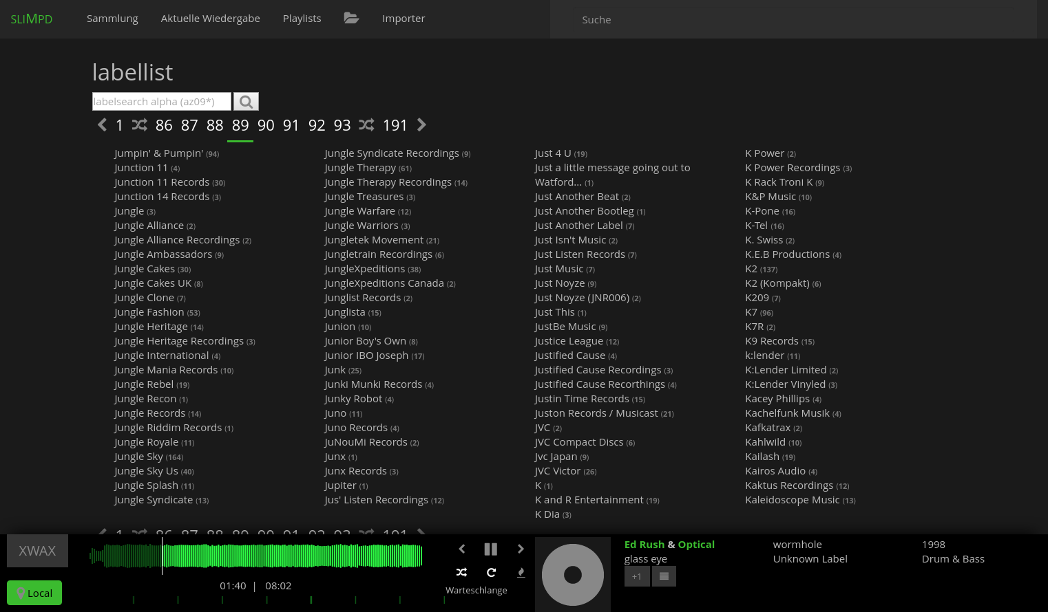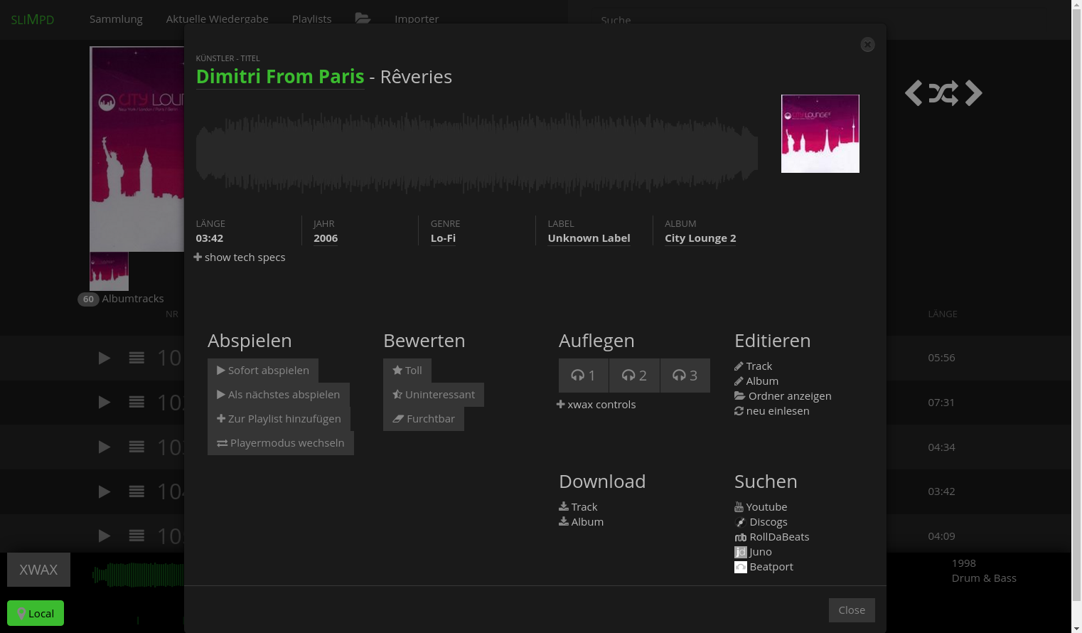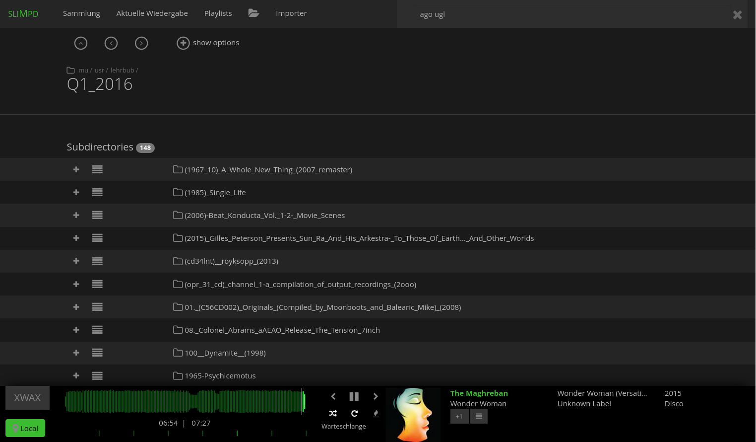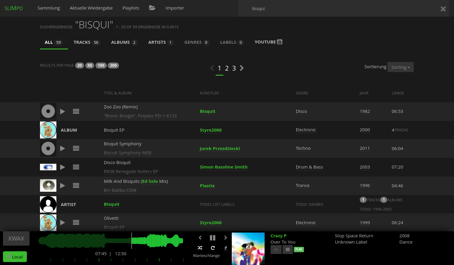 (albums, tracks, artists, genres, labels) with active local-player (green spotcolor)