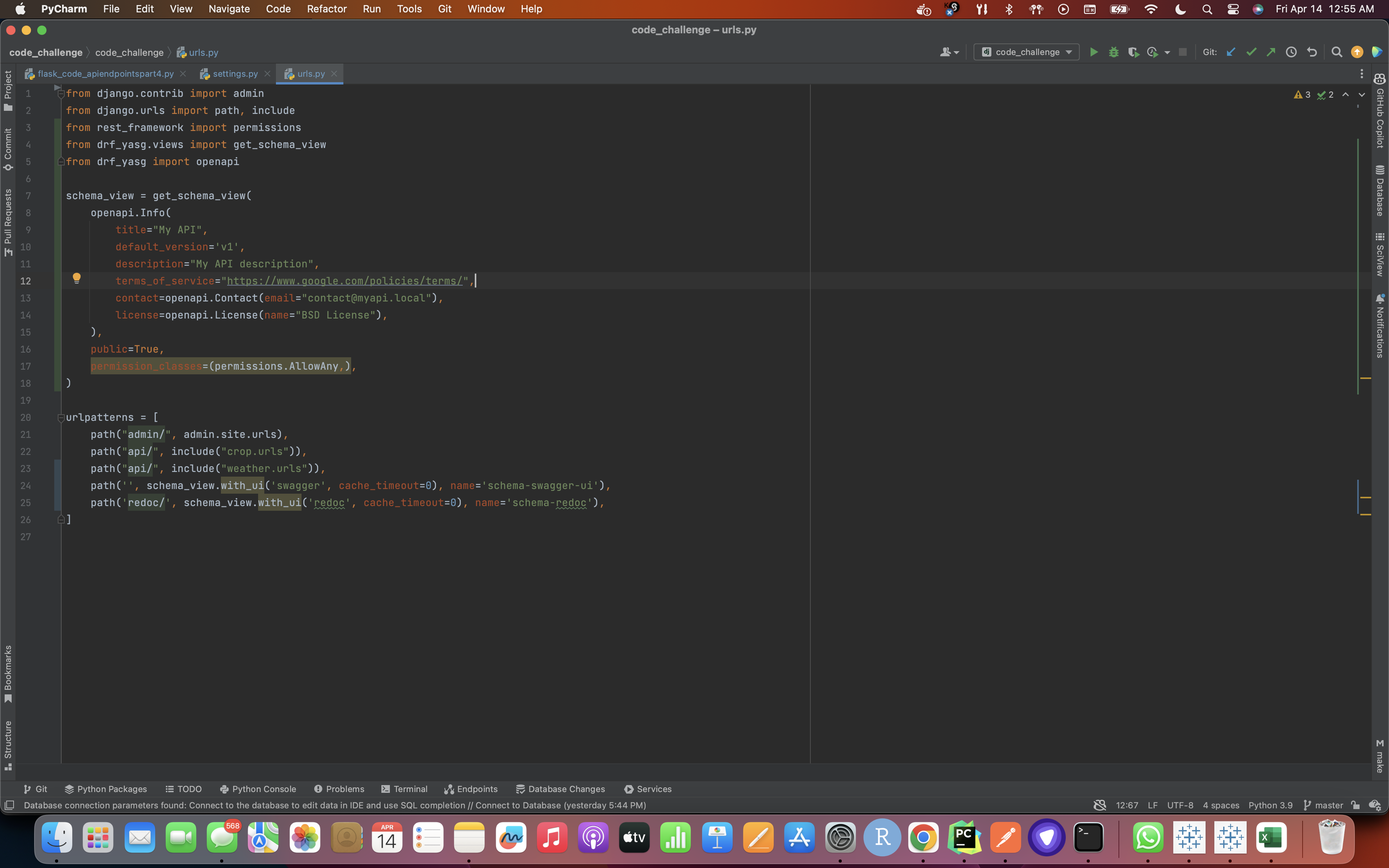 - Adding the drf_yasg.views and rest_framework URLs to the project's urls.py file: (Here we add the code for the Swagger endpoint to "code_challenge/code_challenge/urls.py". This file is the main URL configuration for our project, so it's a good place to add any additional URL patterns.