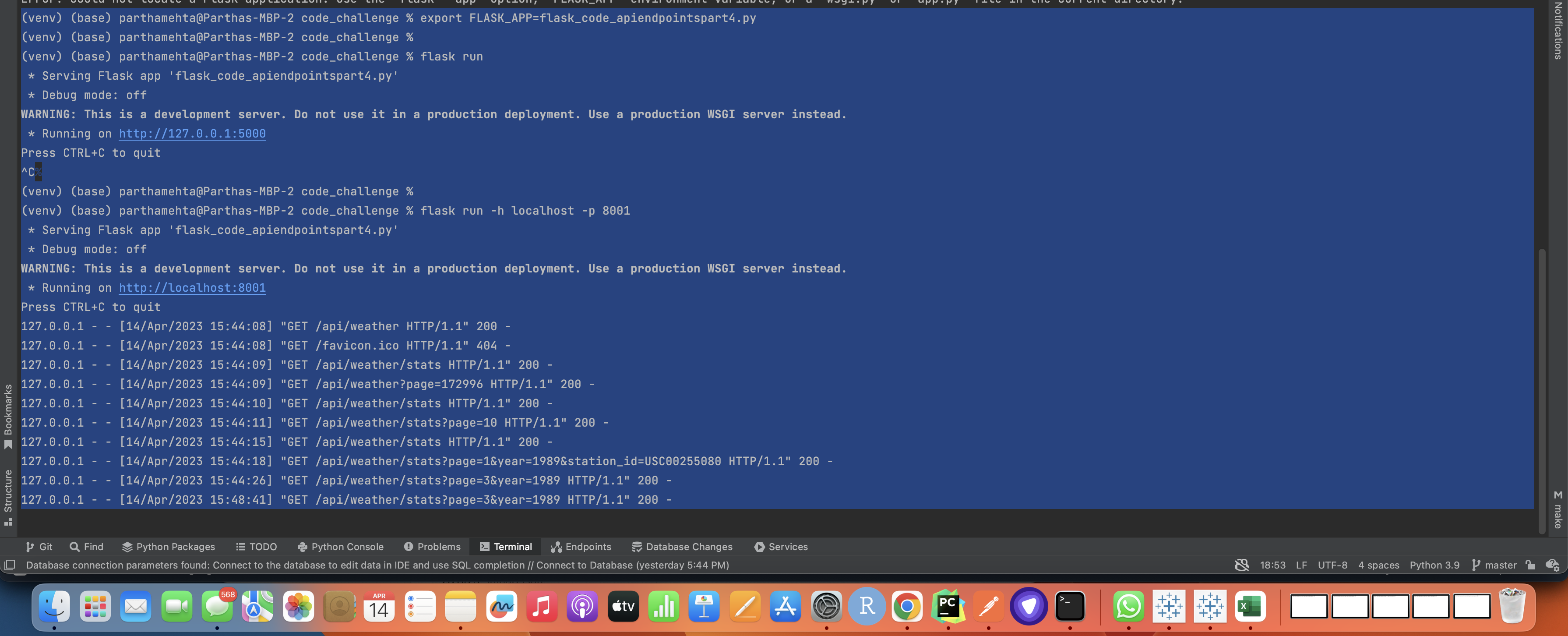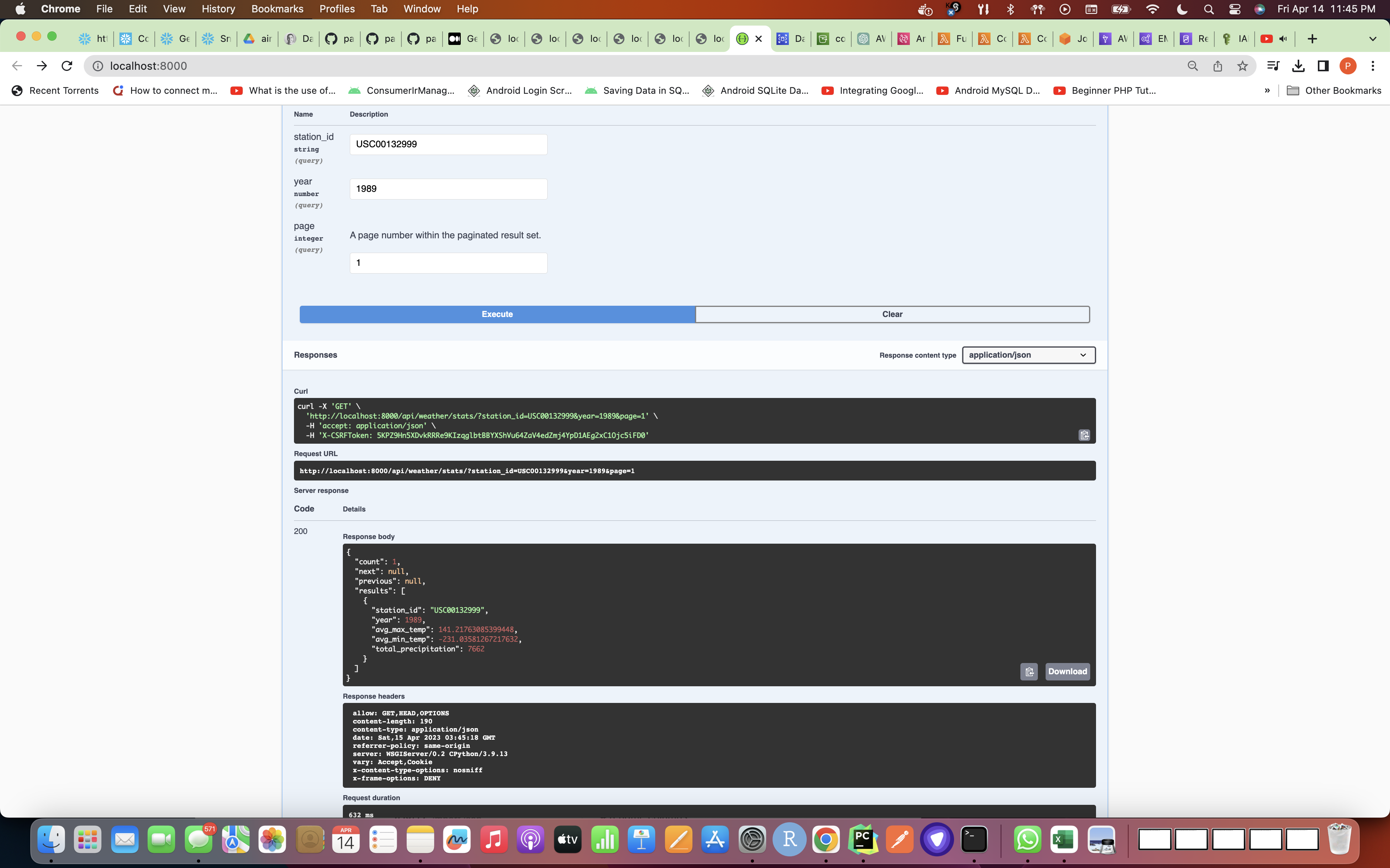 http://localhost:8001/api/weather http://localhost:8001/api/weather?page=172996 http://localhost:8001/api/weather/stats http://localhost:8001/api/weather/stats?page=10 http://localhost:8001/api/weather/stats?page=1&year=1989&station_id=USC00255080