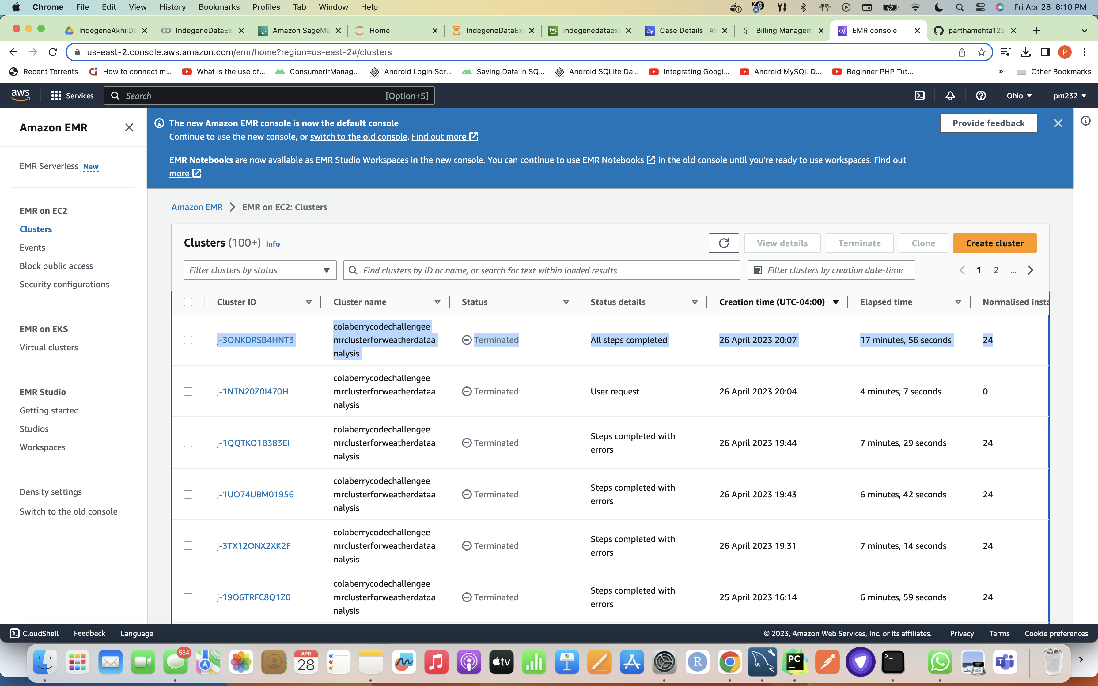Once Glue Job is successful, it triggers EMR and while EMR job / cluster is executing it's task it takes the code from s3 to calculate weather statistics by reading the data from weather_data table which was created to ingest the original data from our data lake i.e S3 to RDS MySQL DB and writes this data with statistics to weather_statistics table in the Redshift Cluster's dev DB. Below is the screenshot for successful completion of all the steps after which EMR gets terminated as it has completed it's task.