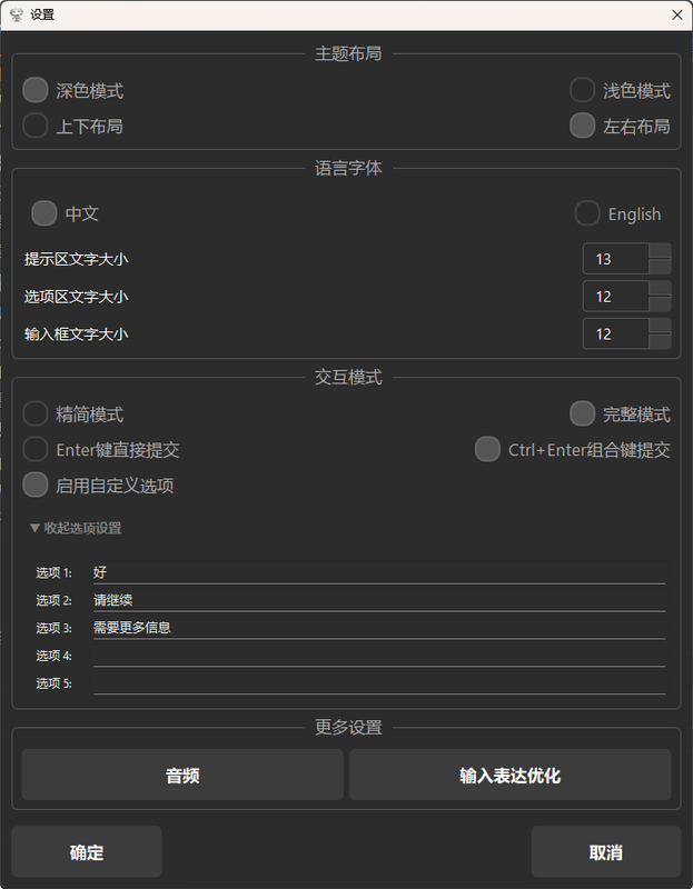 message(str, 可选): 简单模式下显示的简洁问题或提示full_response(str, 可选): 完整模式下显示的AI原始完整回复内容predefined_options(List[str], 可选): 一个字符串列表,每个字符串代表一个用户可以选择的预定义选项。如果提供,这些选项会显示为复选框。