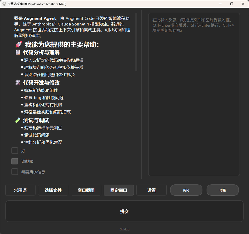 此MCP服务器引入了一种变通方法:它允许模型在最终确定响应之前暂停并请求澄清。模型不会直接完成请求,而是触发一个工具调用 (interactive_feedback),打开一个交互式反馈窗口。然后,您可以提供更多细节或要求更改——模型会继续会话,所有这些都在单个请求内完成。