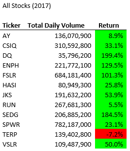 Overall, most of the stocks in this analysis performed significantly better in 2017 than in 2018. As can be seen in the below screenshots only two stocks performed better in 2018 than 2017, RUN and TERP. In addition, there are only two stocks that provided positive returns in 2018, ENPH and RUN, with a 81.9% and 84% return rate respectively. When compared against the Total Daily Volume, both ENPH and RUN had significant increases in the volume of stock being traded. ENPH's Total Daily Volume in 2018 increased by 174% while RUN's Total Daily Volume increased by 88%, when compared to 2017. A large increase in Total Daily Volume can indicate that there is an increased level of interest in the respective stock, especially by large institutional investors. This interest can help drive up the price of the stock and could indicate that it is a worthwhile stock to invest in. However, the Total Daily Volume should not be considered as an independent factor when considering which stocks to invest in. DQ also had a large increase in Total Daily Volume between 2017 and 2018 but its year over year return saw a sharp decline. Given that this dataset is looking at a full year it is possible the data is slightly skewed. DQ performed much better at the beginning of 2018 and its performance did not start declining until later in the year. Going forward it might make more sense to look at stock performance trending by month or quarter to be able to identify changes in performance faster and adjust an investing strategy appropriately.