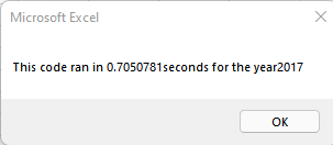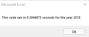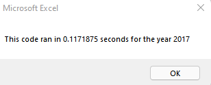 The refactored code ran consistently faster than the original script. The original script took 0.71 seconds for 2017 and 0.68 seconds for 2018. While the refactored code took 0.11 seconds for 2017 and 0.30 seconds for 2018. You can see the screen shots below that show the MsgBox output indicating the time it took to gather all data and create the outputs.