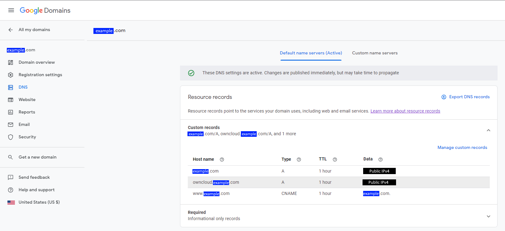 A domain will be needed for secure access outside of your network, as well as, HTTPS. I use Google Domains but any provider will work. Create a custom record inside of "DNS". The hostname can be any name, but for most people, the first record should be "owncloud". This will set the URL to owncloud.example.com. The type needs to be "A" unless you are using IPv6, in that case use "AAAA". The TTL default of "3600" is fine. For Data, enter your public IPv4 address, not the local Ubuntu-Server IP address. If using IPv6, enter that instead. Do not give your public IP address to anyone you do not trust. This is why a domain is important.