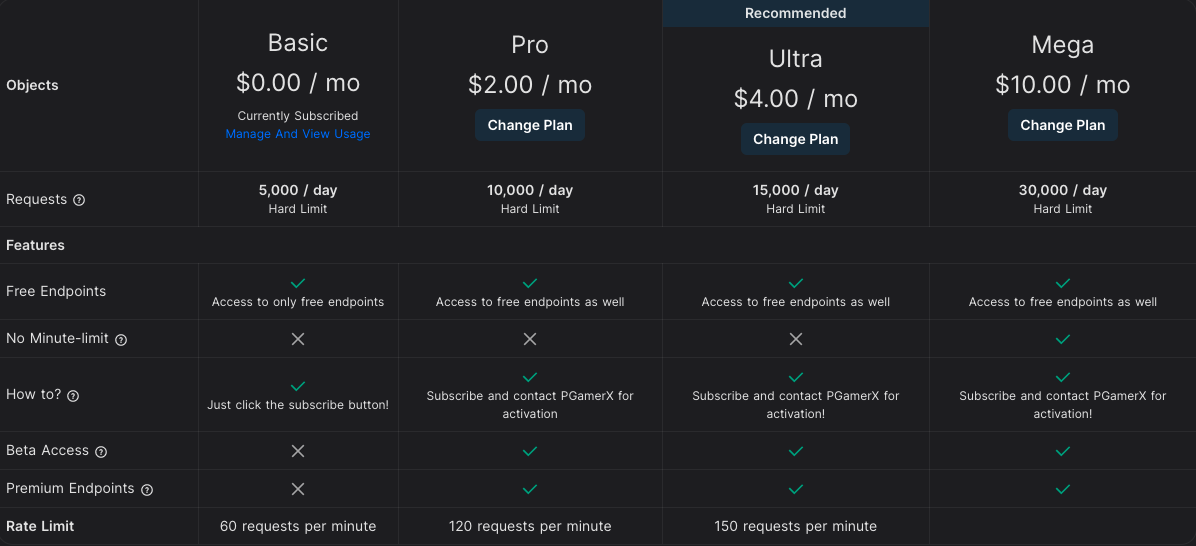 The API is only usable through RapidApi, to use the API, head over to RSA's RapidApi page and navigate to Pricing tab.
