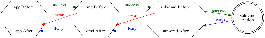 }Whenever a valid command is called by the user, all the before interceptors defined on the app and the intermediate commands will be called, in order from the root to the leaf.