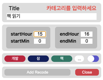 - 제목, 시작시간, 종료시간(선택), 카테고리, 활용한 시간인지 여부를 입력하고 Add Recode를 클릭하면 기록이 추가됩니다.