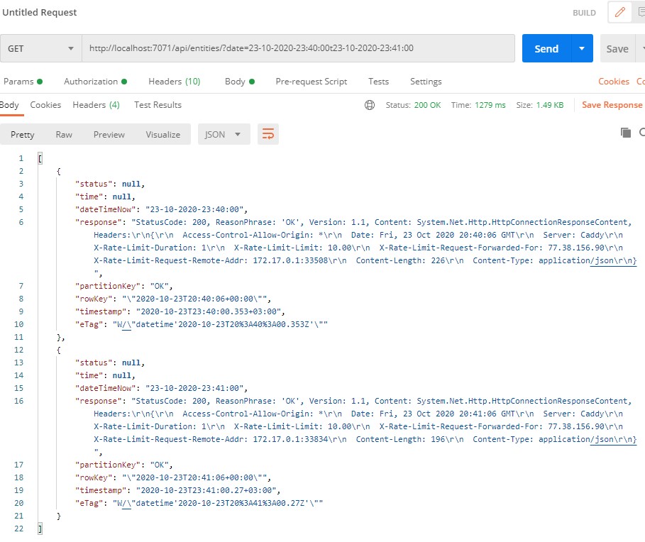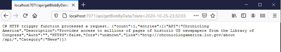 http://localhost:7071/api/entities/?date=23-10-2020-23:40:00t23-10-2020-23:41:00To find a blob file from specific date: (format: yyyy-MM-dd-HH:mm:ss)