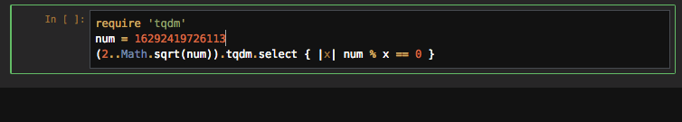 (2..Math.sqrt(num)).with_progress.reject { |x| num % x > 0 }.map { |x| [x, num/x] }