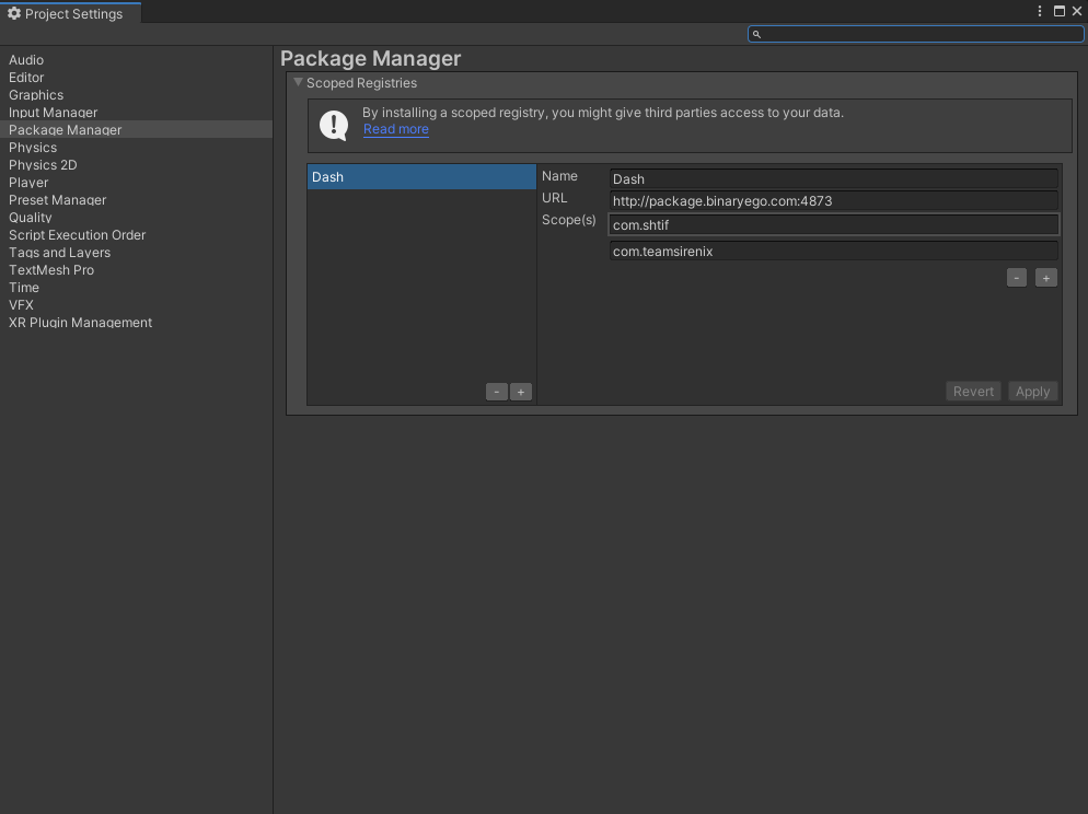 If you have com.teamsirenix.odinserializer scope defined in your registries already just use com.shtif to avoid scope duplication. Also if you are using OdinSerializer in your project already you don't need to install it Dash should link it using the Assembly Definition reference. If Dash can't find the OdinSerialializer you can also modify the Dash Assembly Definition files in Dash folders Runtime and Editor to correctly include your OdinSerializer reference.