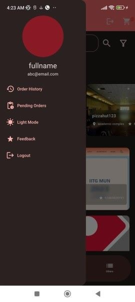 On the owner's home screen, the owner can also see a side drawer like a user where the owner can see profile, order history, pending orders, insights, change mode to the light mode or dark mode, feedback for the app, and a logout option.