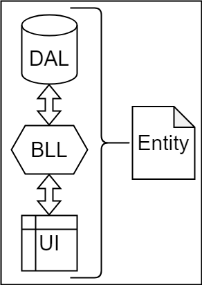- Proyekt n-qatlı arxitektura üzərində qurulub. Hər bir qat ierarxiya üzrə özündən bir əvvəlki/sonrakı qat ilə əlaqə qurur (Entity qatı istisna olmaqla, çünki entity siniflərinə ehtiyacı olan hər bir qat Entity qatını referans alıb entity siniflərini istifadə edə bilər), sxem olaraq ifadə etsəm: