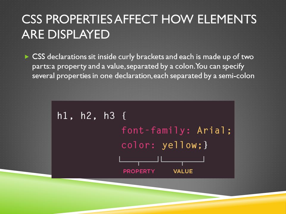 CSS declarations sit inside curly brackets and each is made up of two parts: a property and a value, separated by a colon. You can specify several properties in one declaration, each separated by a semi-colon.