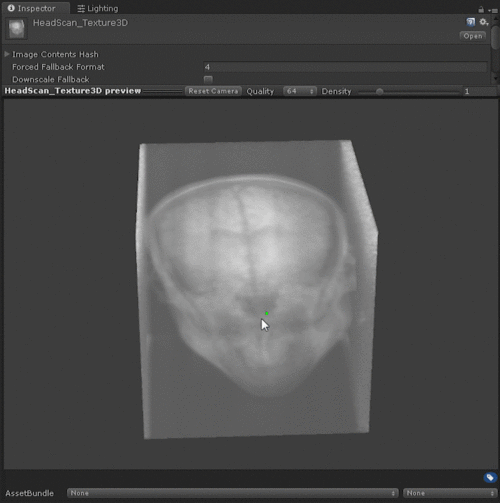 When selecting a Texture3D asset in the Project windows, Unity will display an preview of the Texture3D in the Inspector.
