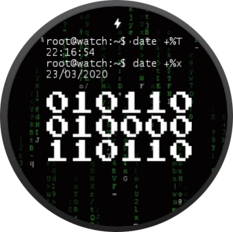 Simple watch face with binary digits, terminal commands replica and a fancy background.