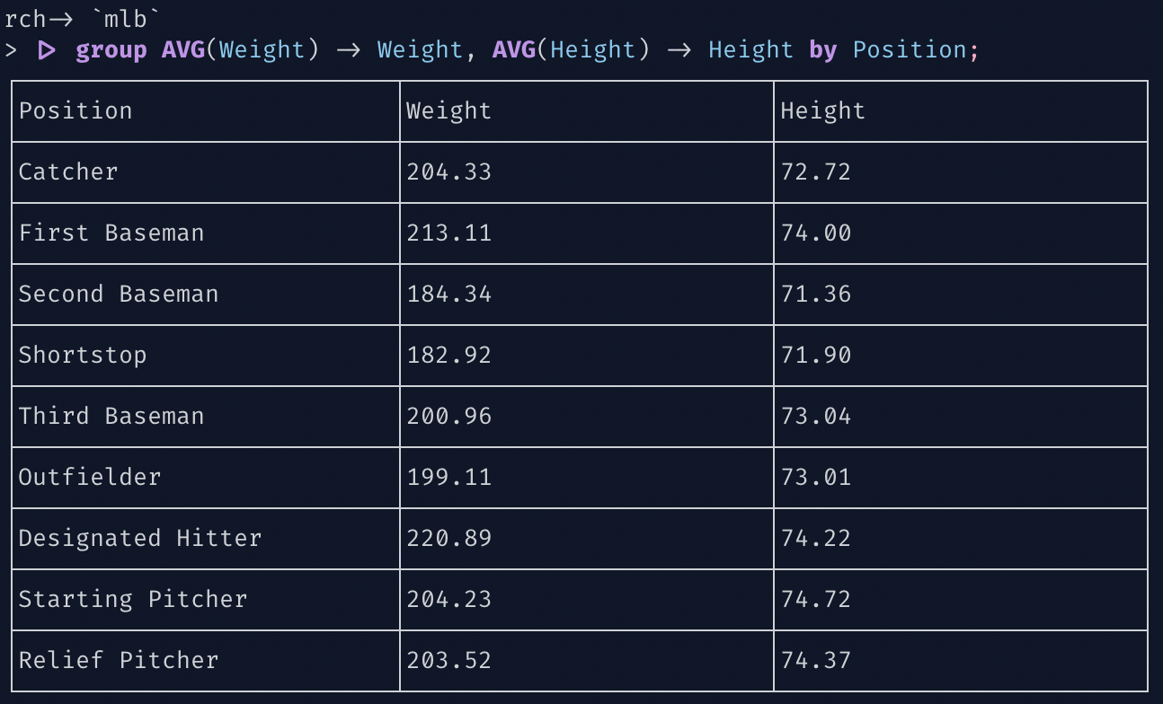 'Pets' |> GROUP MAX(Weight) -> Thiccest BY Type