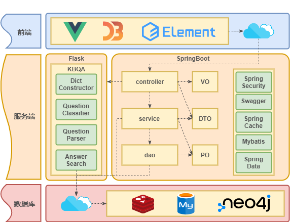 - 智能应用服务:提供知识图谱智能问答的算法支持,作为微服务,请求由知识图谱服务统一转发。