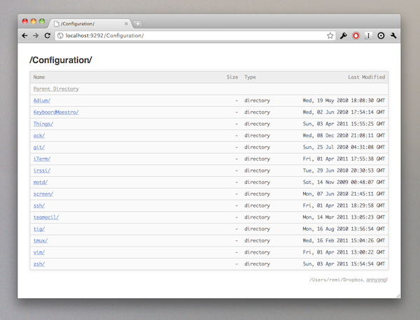 Annyong starts a public static Web server in the current directory, allowing people in your local network to browse your files.