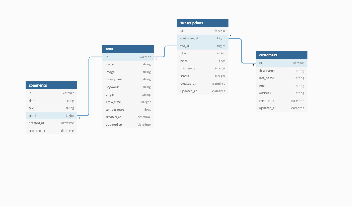 Tea leaf is a JSON API 1.0 spec-compliant REST API built in Rails with endpoints for users to subscribe a customer to a tea subscription, cancel a customer's tea subscription, and to see all of a customer's tea subscriptions (including active and cancelled). In addition, users can create customers and create teas. for purposes of exposing and consuming.