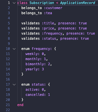 }With update, a user may change the frequency and/or status columns, which are coded as enums inside the subscription model