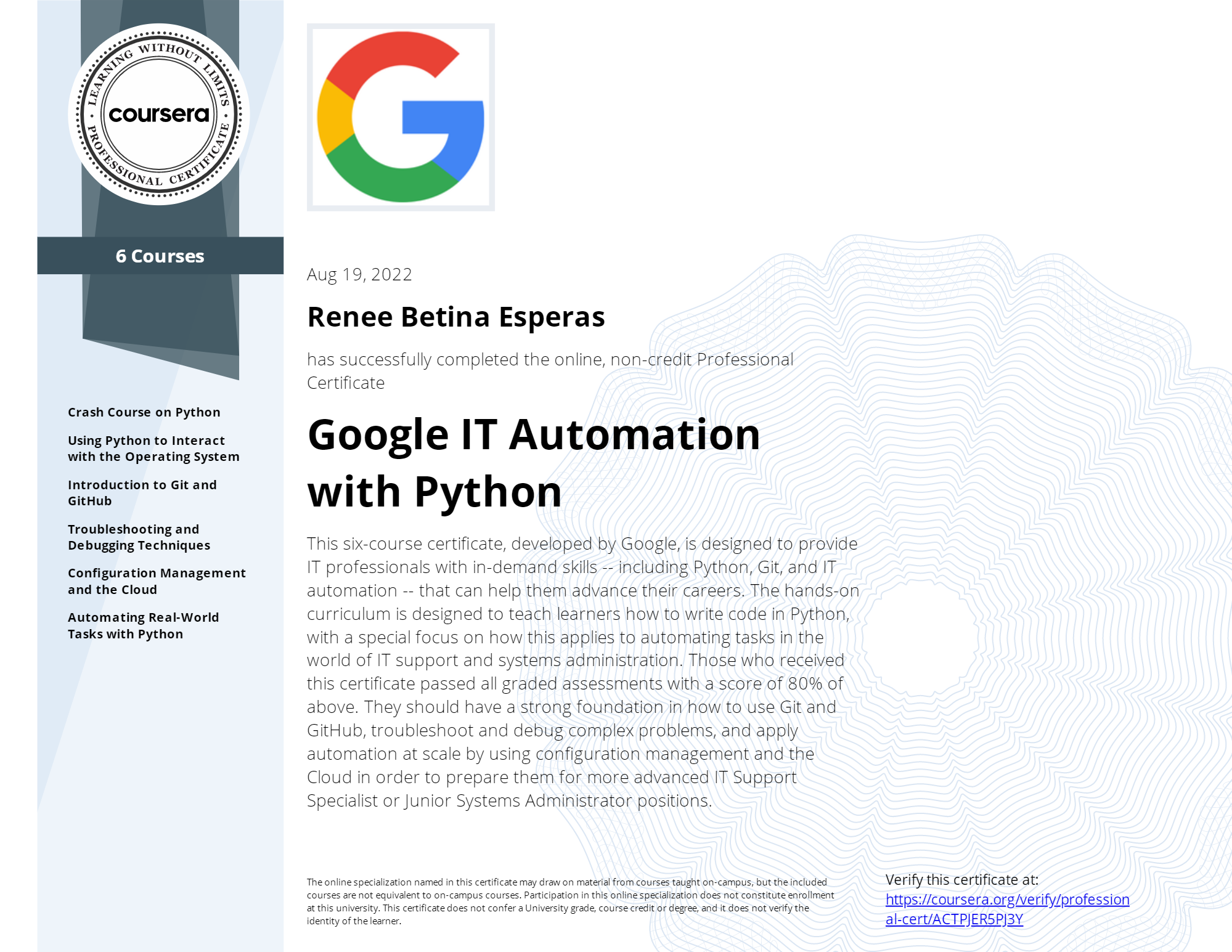 gcp-python Renee Betina Esperas Google IT Automation with Python Verify this certificate at: https://coursera.org/verify/professional-cert/ACTPJER5PJ3Y https://www.credly.com/badges/c3423a80-106e-47e8-b8b9-3e579645adc6