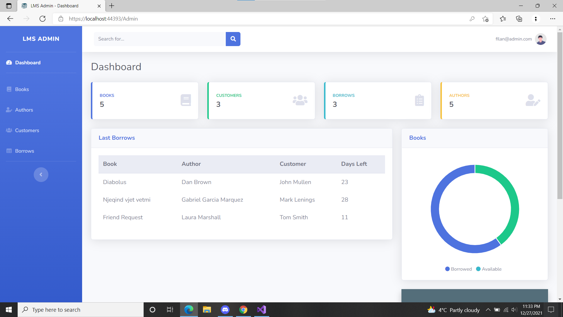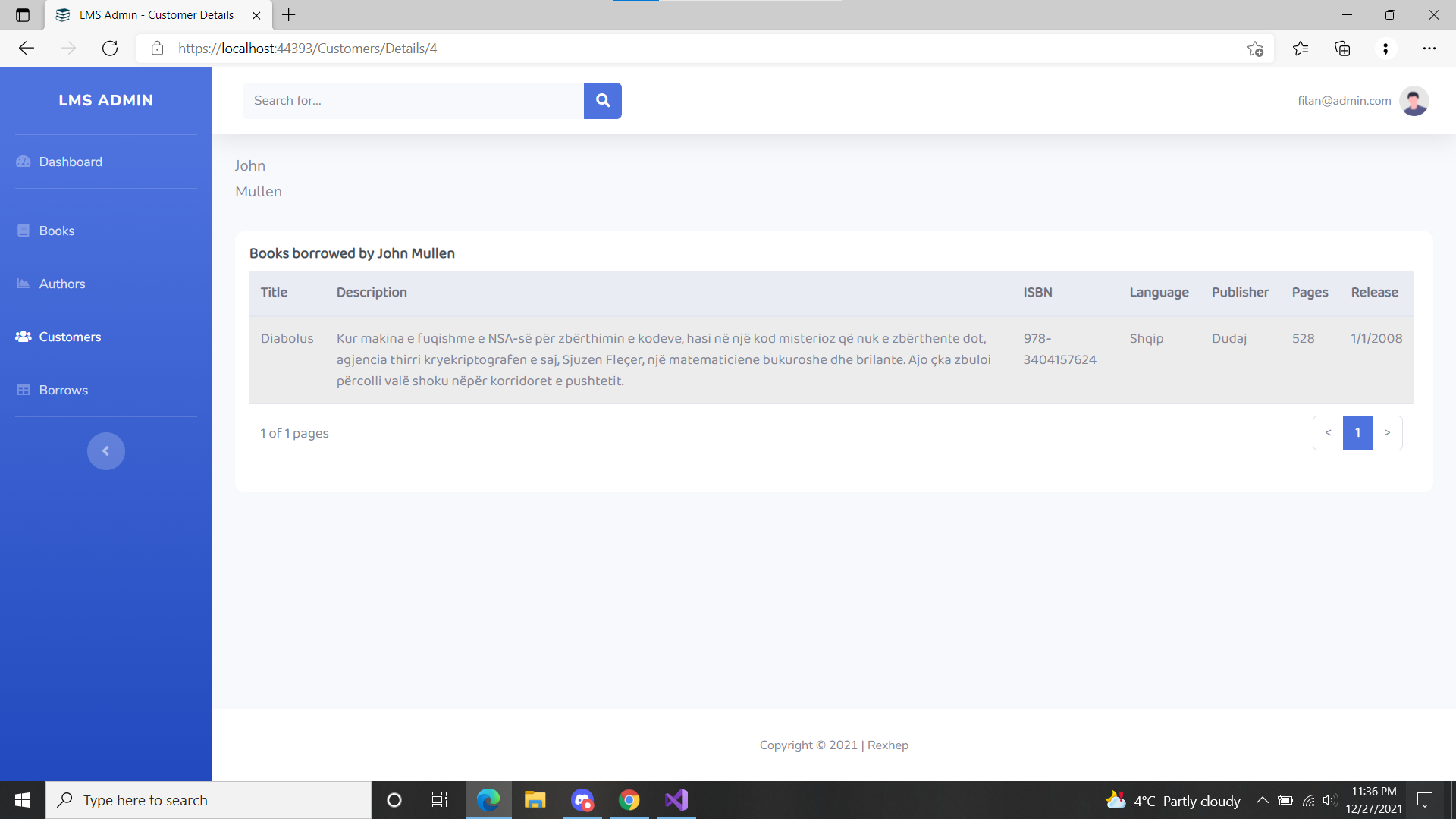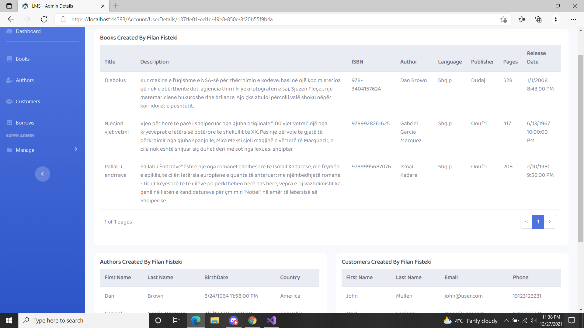 A management system for library to manage books, customers and borrowed books. System allows admins to search book by title and author, Add, Edit, Delete books, customers, borrowed books, View Customer and Author details. Super admin can register new admins and view their activity in system.