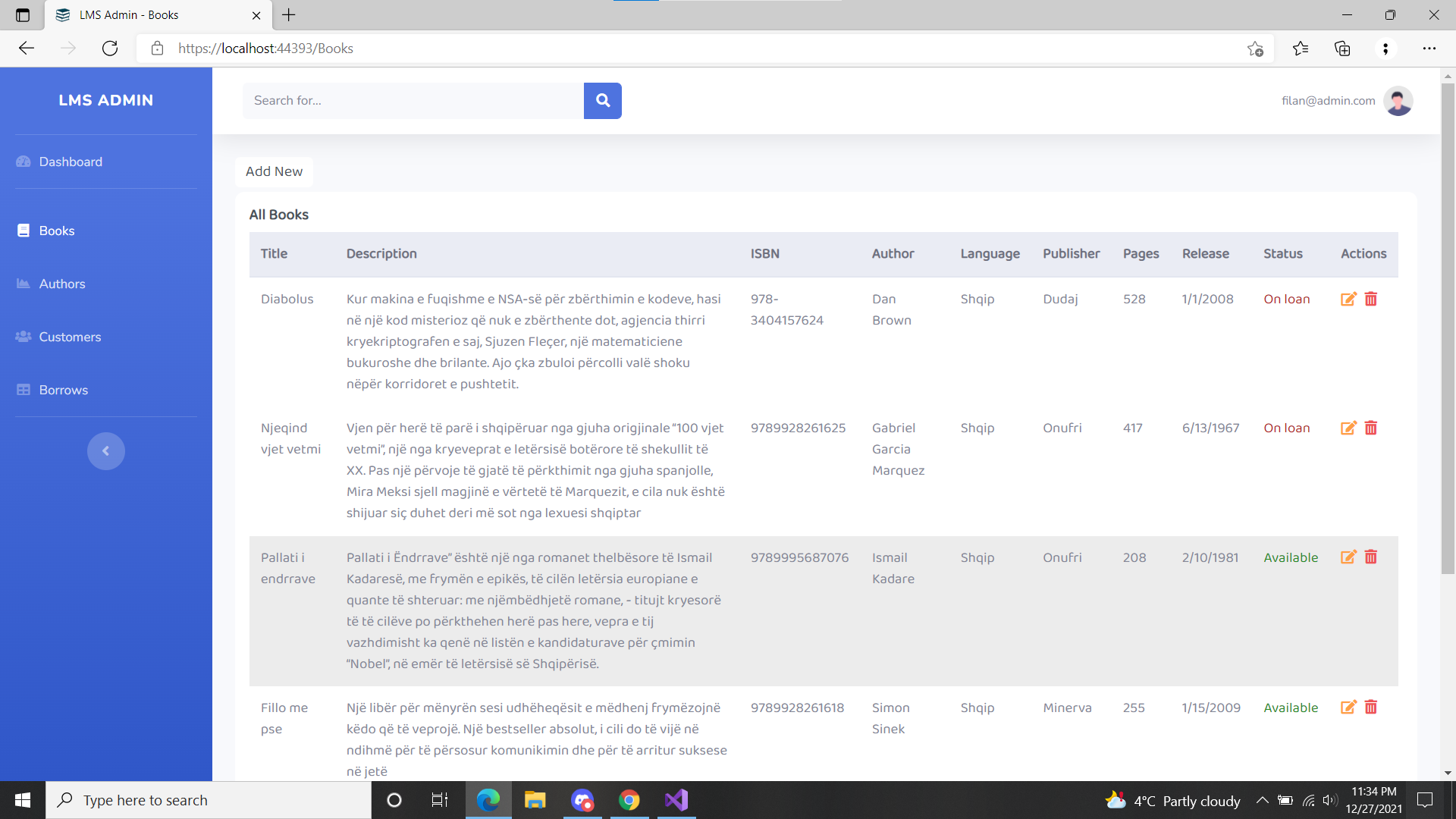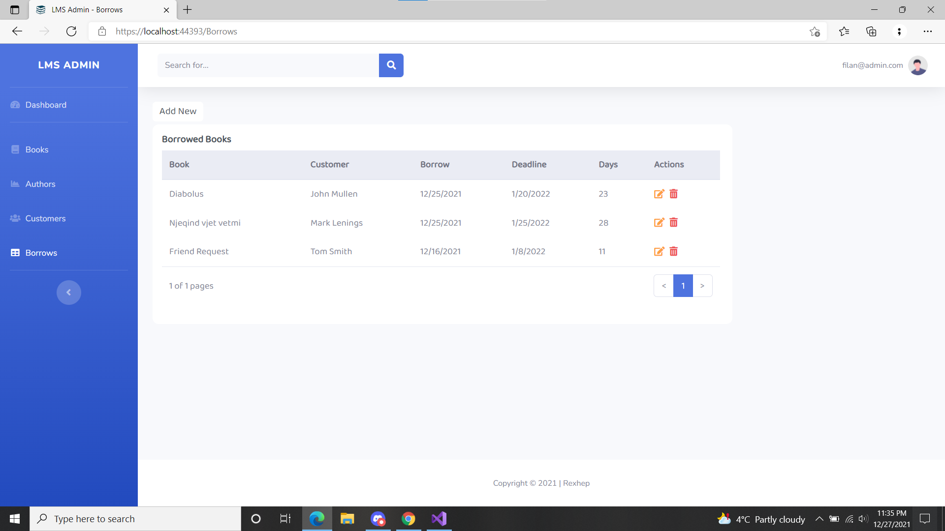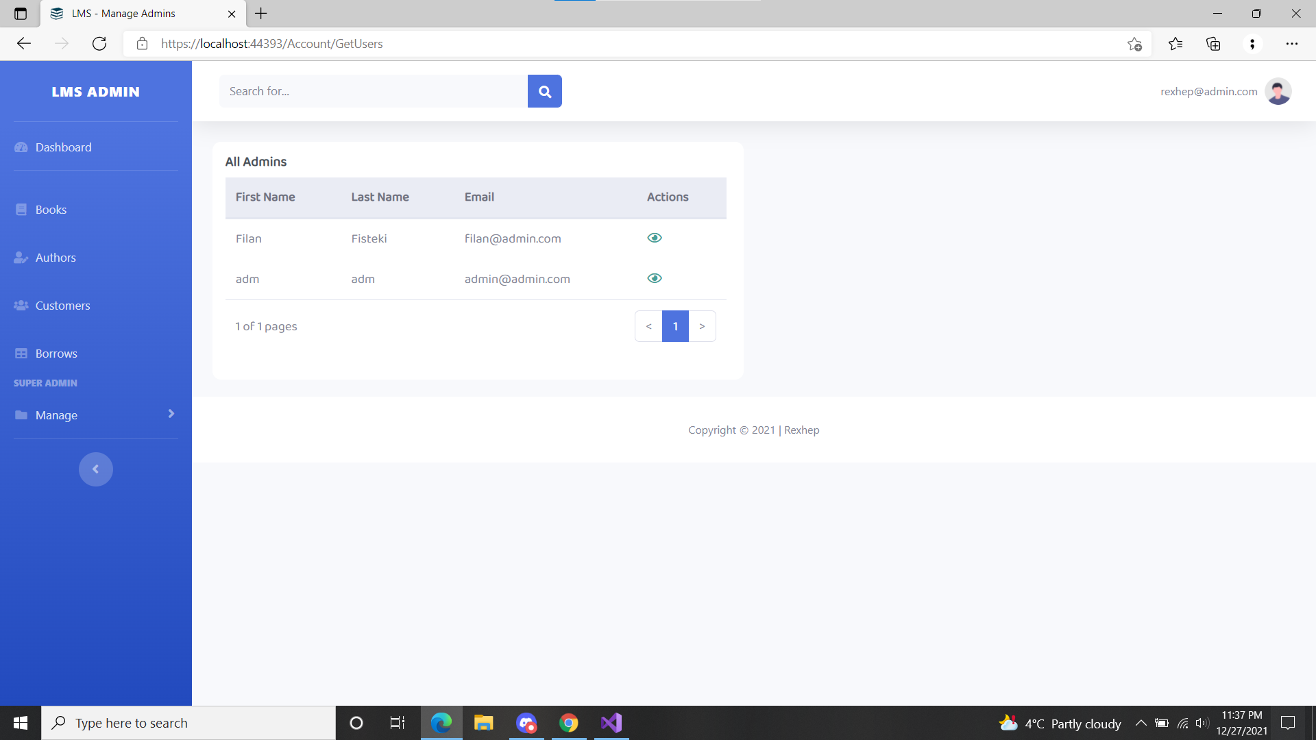 A management system for library to manage books, customers and borrowed books. System allows admins to search book by title and author, Add, Edit, Delete books, customers, borrowed books, View Customer and Author details. Super admin can register new admins and view their activity in system.