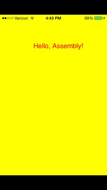 The drawing code is all done using CoreGraphics, and displays the string 'Hello, Assembly!' in red on the screen. Here's a screenshot of the app running on my iPhone 5S: