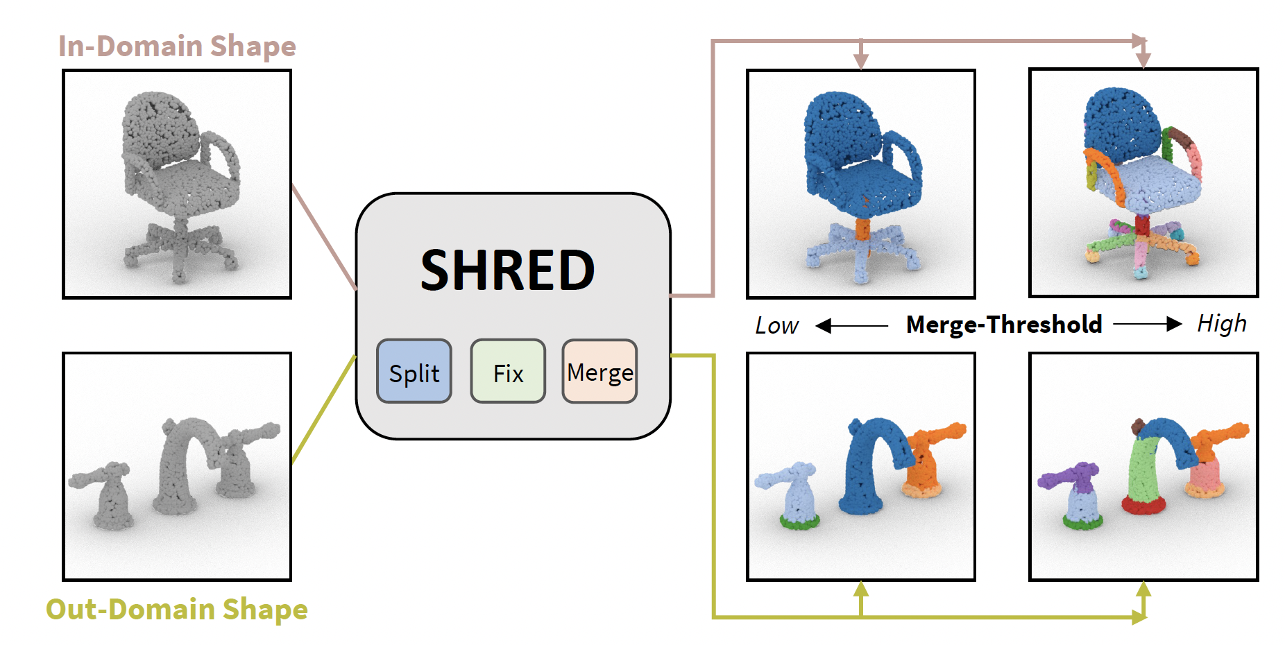 SHRED is a method for 3D SHape REgion Decomposition that consumes a 3D shape as input and uses learned local operations to produce a segmentation that approximates fine-grained part instances. A merge-threshold parameter can be adjusted to change decomposition granularity depending on the target downstream application