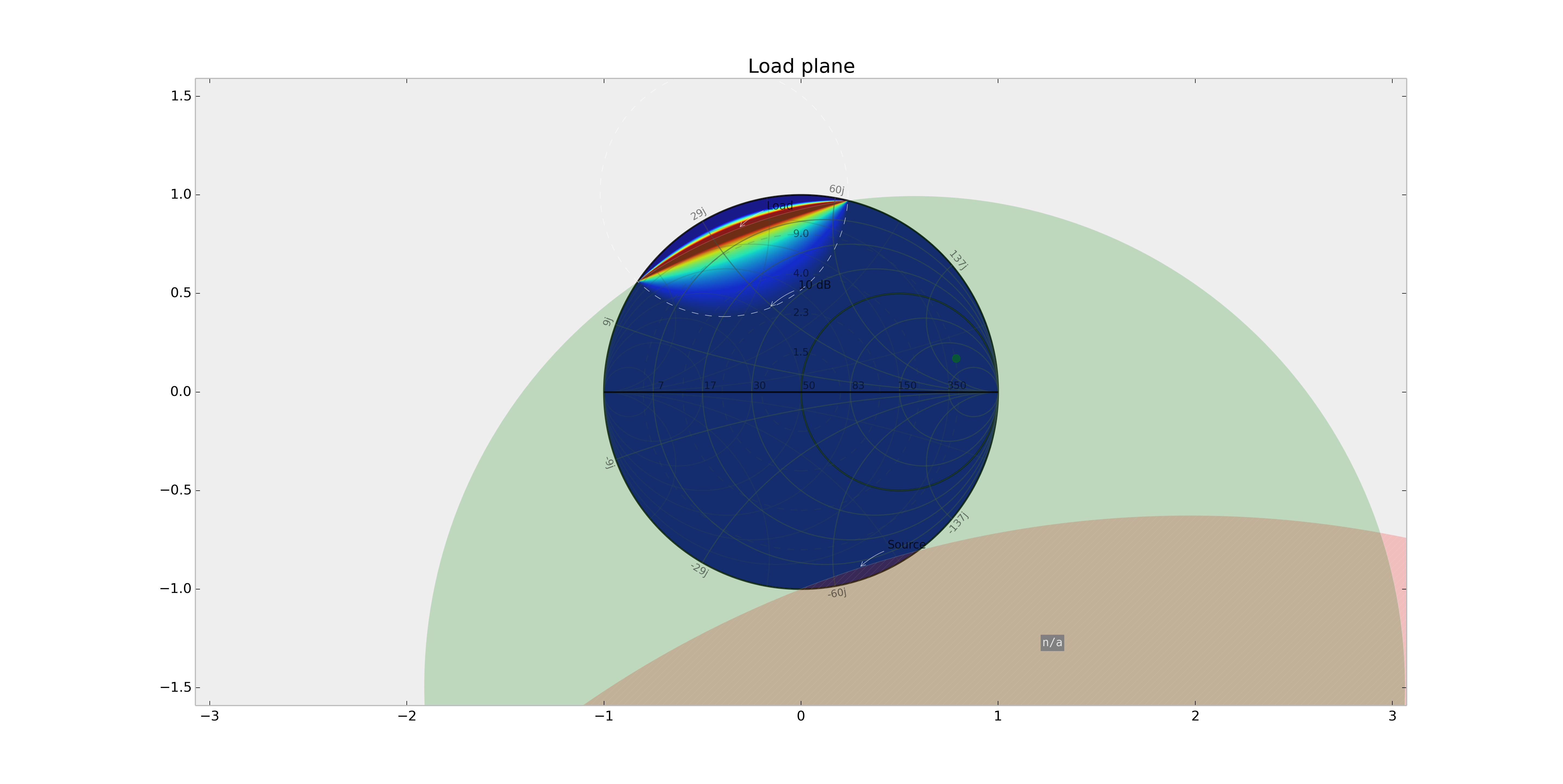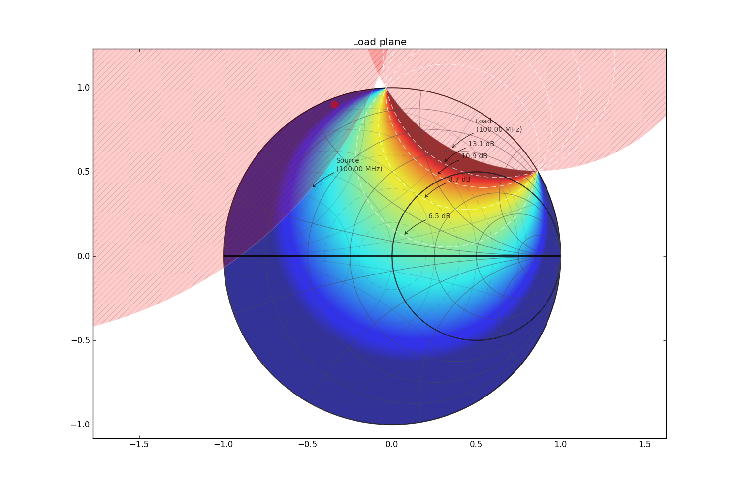 print network.rollett_k() # stability factor (< 1.0 implies potential instability)A few sample plots (see test.py for the code):