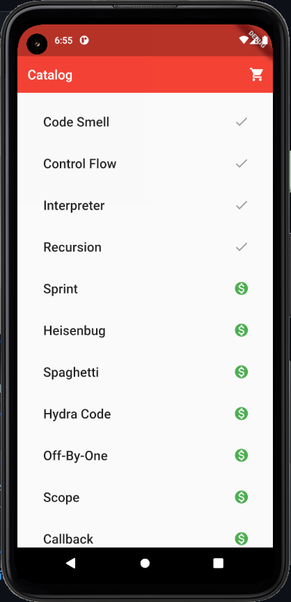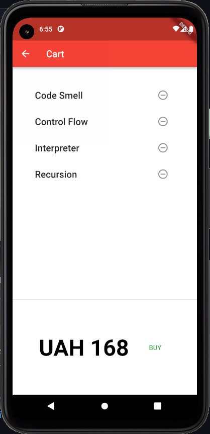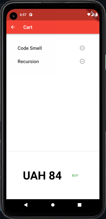 the first one is a list of items that you can add to the cart (the second screen) by clicking on the icon on the right side of an element. Also, you can delete items from the cart using the round icon on the right side of the element, see the total price of the added elements and click on the "buy" button which functional maybe will be added in the future.