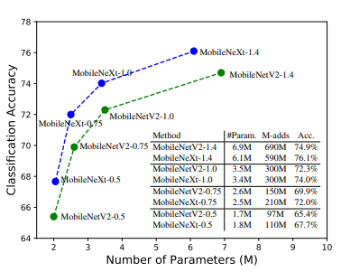 A TensorFlow and PyTorch implementation of MobileNeXt architecture: Rethinking Bottleneck Structure for Efficient Mobile Network Design. The authors rethink the necessity of inverted residual block and find it may bring risks of information loss and gradient confusion. They thus propose to flip the structure and present a novel bottleneck design, called the sandglass block, that performs identity mapping and spatial transformation at higher dimensions and thus alleviates information loss and gradient confusion effectively. In ImageNet classification, by simply replacing the inverted residual block with the sandglass block without increasing parameters and computation, the classification accuracy can be improved by more than 1.7% over MobileNetV2.