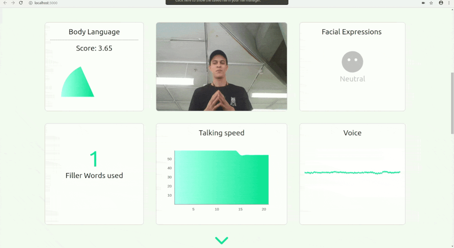 We'd like to transform the app into an actual service where people could log in and save their presentations so they can look at past recordings and results, and track their progress over time. We'd also like to implement a feature in the future where users could post their presentations online for real feedback from other users. Finally, we'd also like to re-implement the communication endpoints with websockets so we can push data directly to the client rather than spamming requests to the server.