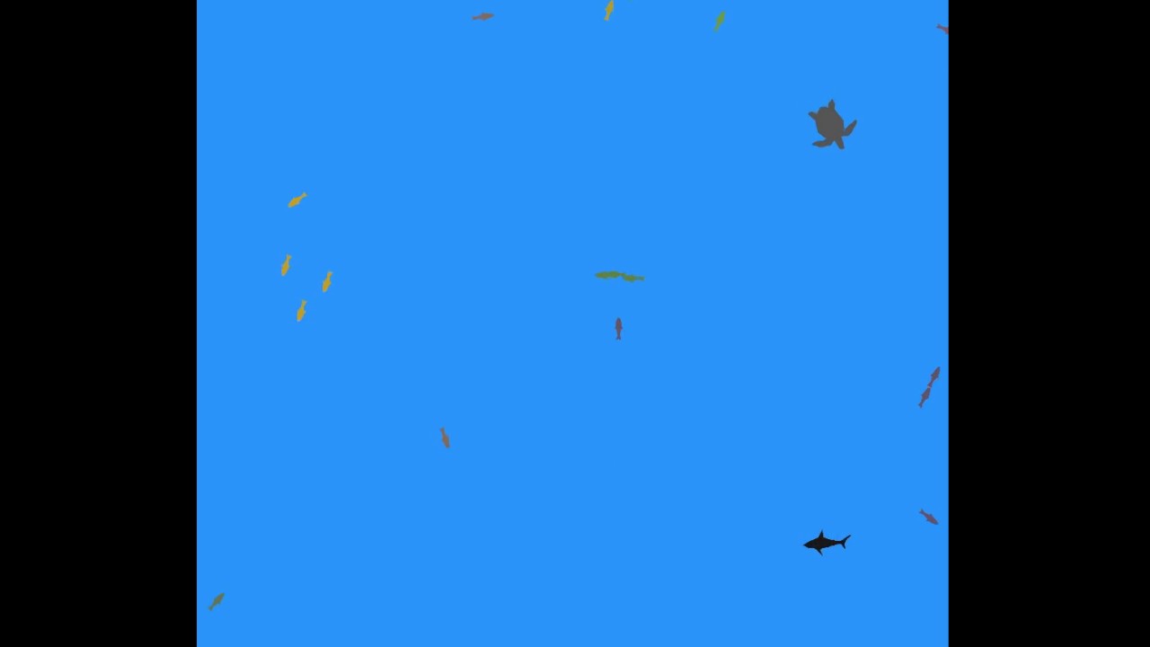 Video demonstrating the simulation initialized with: 50 Minnow fishes, 1 turtle and 4 sharks. Fishes in the same group have same color [![Alt text] (https://img.youtube.com/vi/-whSFRU2zZg/maxresdefault.jpg)] (https://youtu.be/-whSFRU2zZg)
