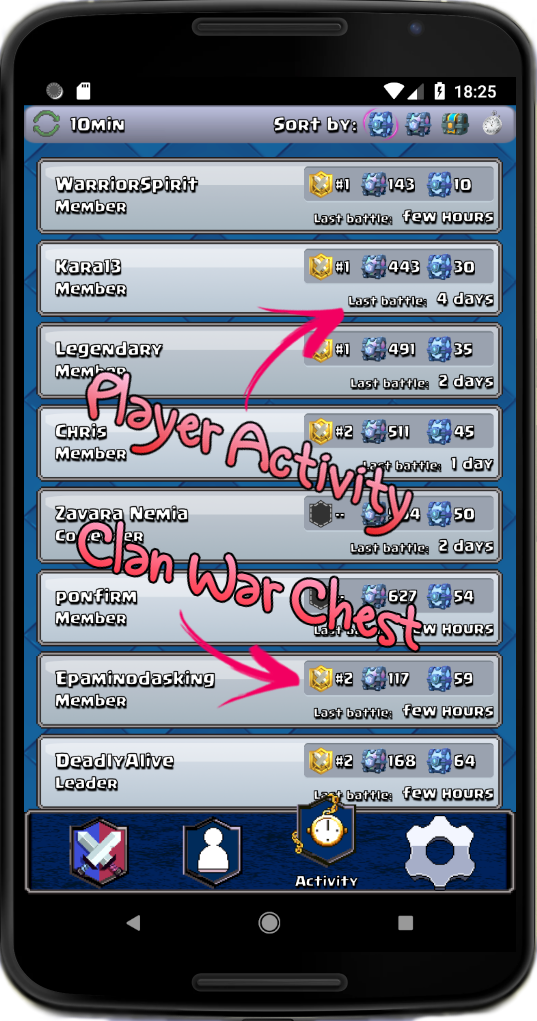 SakuraStats is an Android app that gathers players' stats of the same clan. You can use it for your clan to determine which players are performing well in Clan Wars, which of them still have low level cards and who are inactive.