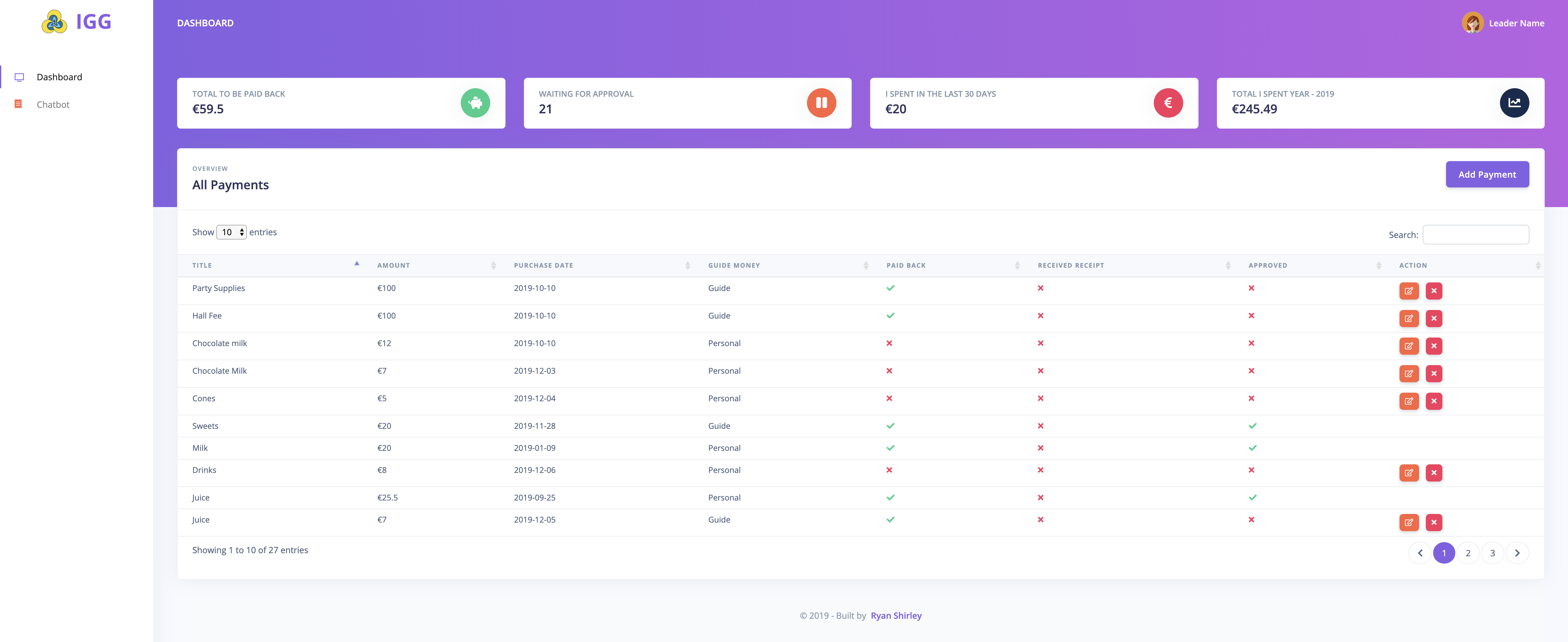 Payments are added by leaders but require approval by an admin. This allows admins to keep track of individual leader expenses and total organisation expenses. Admins are also able to input incoming money.