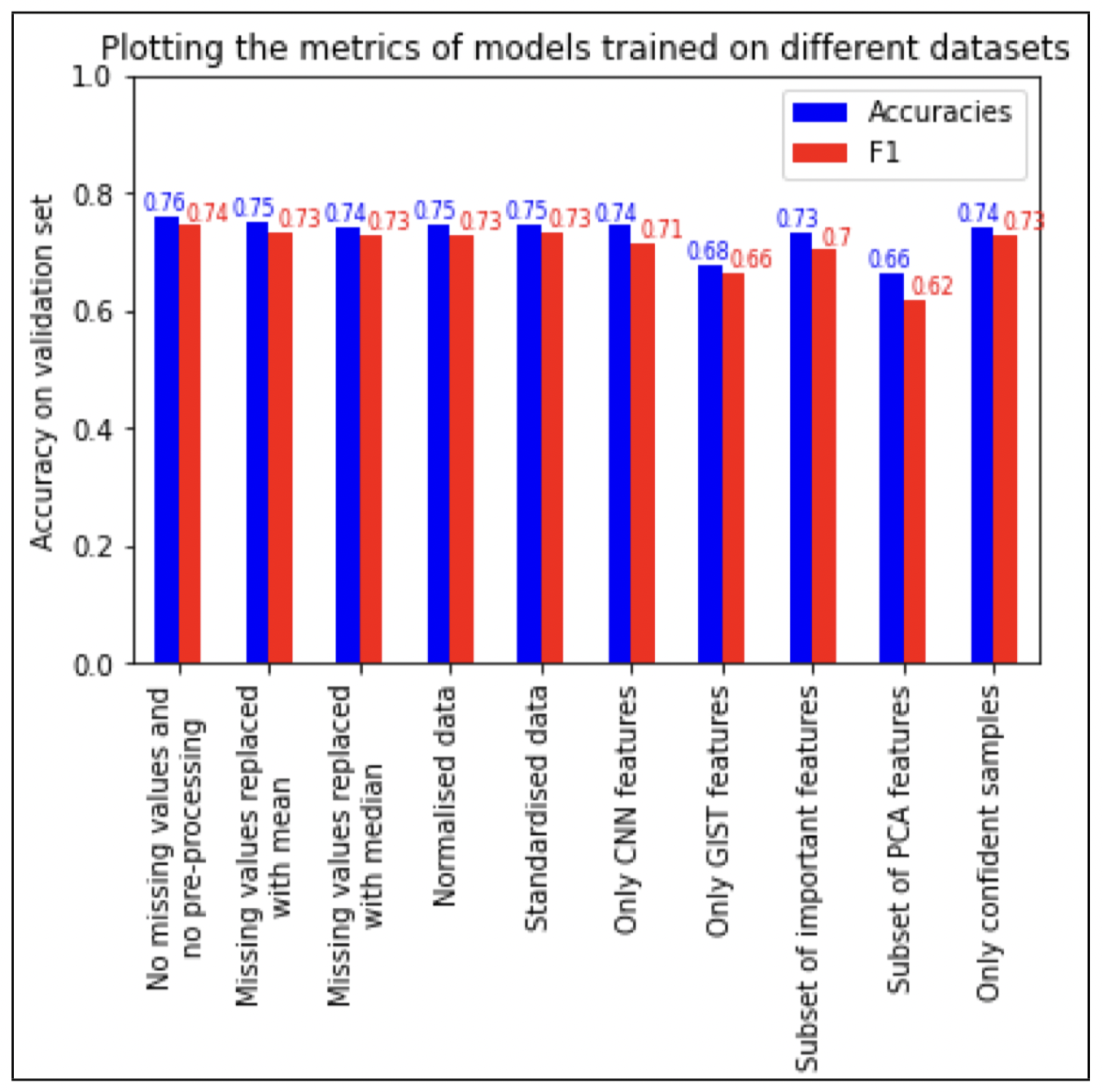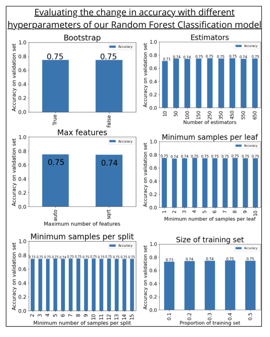 We experimented with 6 different hyper-parameters of our RFC model and plotted their average accuracy. This provides the experimental evidence to choose the hyper-parameters of our model that will maximise its performance. Metrical comparison of evaluated RFC models with the same hyper-parameters, trained and validated on different data sets. The impact of the training set is measured as the average accuracy- and F1-score on the validation set over 10 runs. Confusion matrix of our final model, with the only pre-processing being the imputing of missing values with the mean. The hyper-parameters were chosen through the experimentation in the section on hyperparameter selection.-