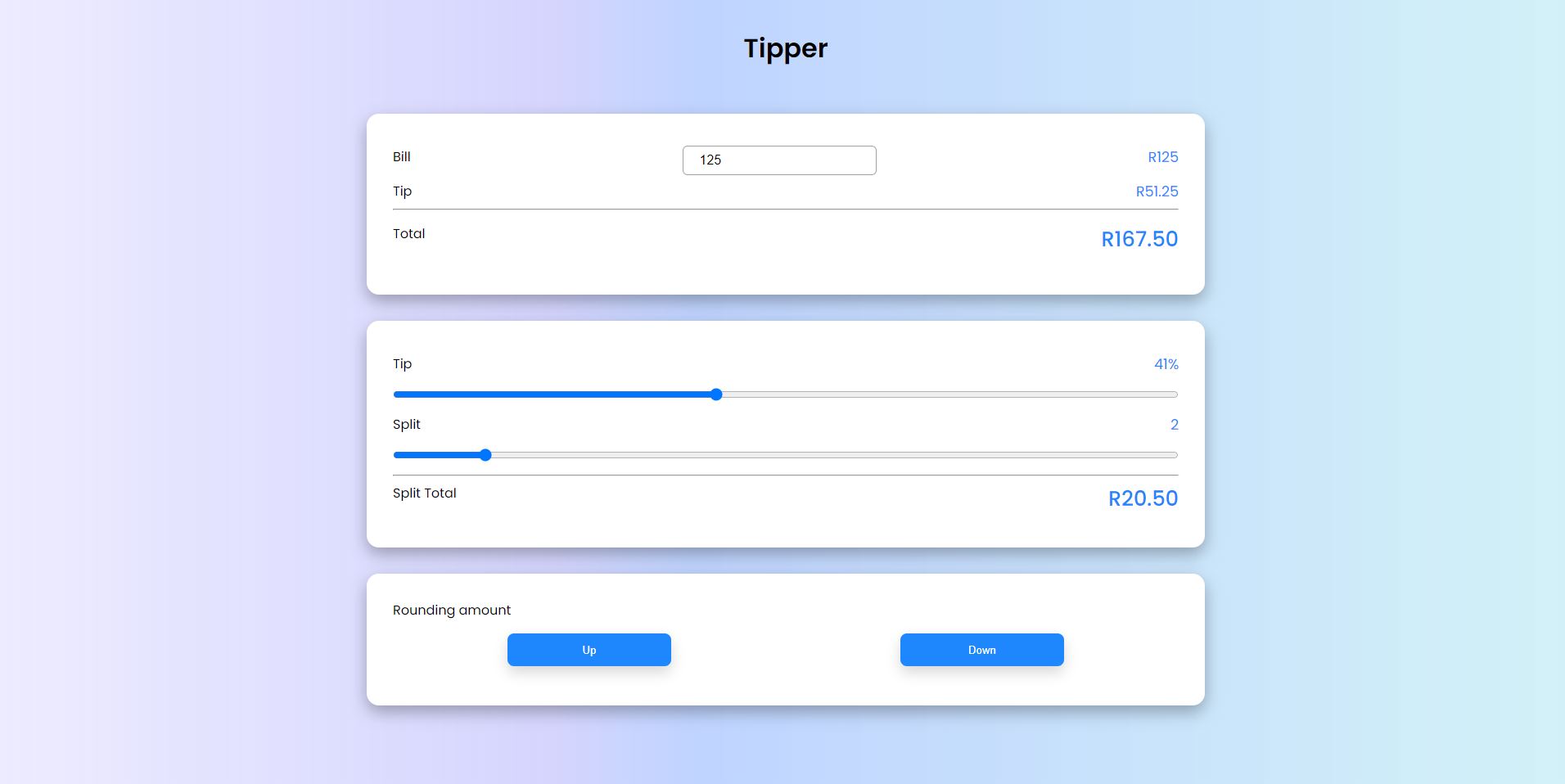 Tipper App Live Tipper - Github Pages Purpose of Tipper is to calculate your tip! Tools React.JS - Hooks, useState, useEffect To run use npm i && npm start