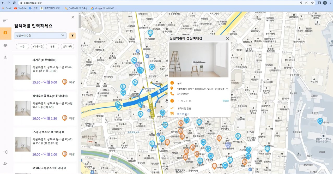- 성신여자대학교 주변의 가게를 식당, 휴게음식점, 병원 별로 나누어 확인할 수 있습니다 (필터 기능)