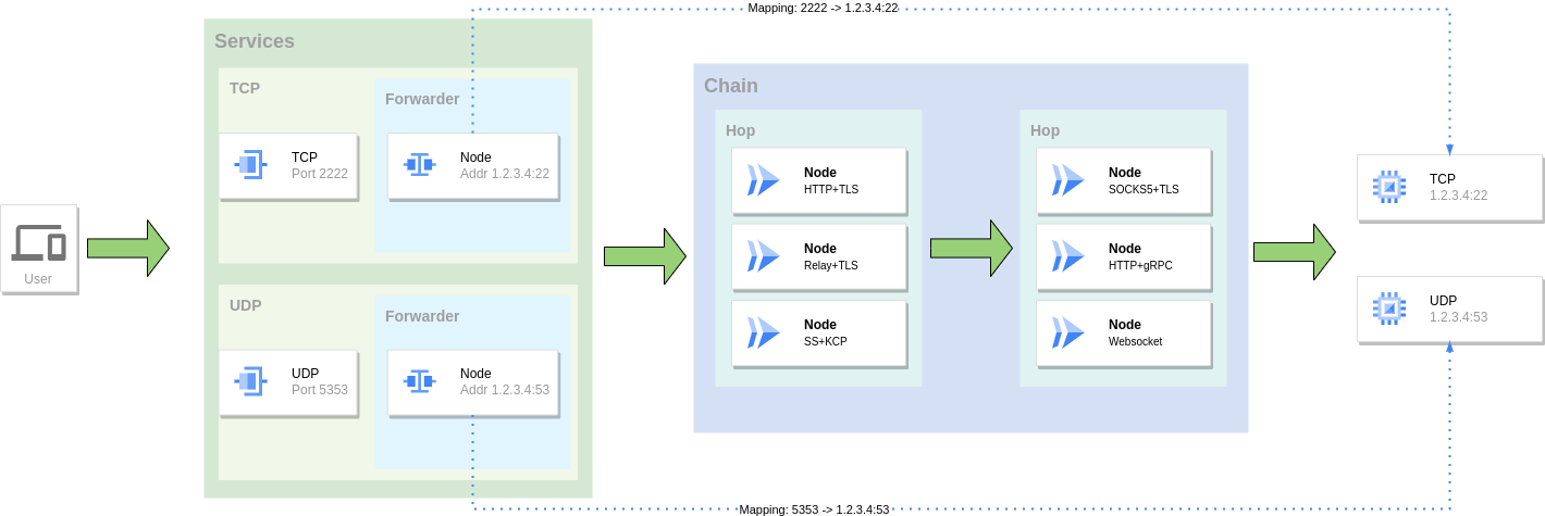 将一个服务的端口映射到另外一个服务的端口,同样可以组合使用多种协议组成转发链进行转发。
