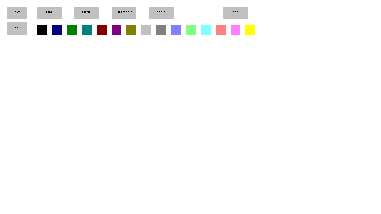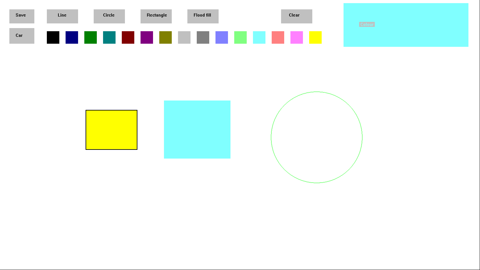 Using this application one can draw lines, circles, rectangles, and fill colour in desired space. There are 15 colours to choose from. Using the "clear" button one can clear the screen and using the "save" button one can save the drawing as a jpeg file. The jpeg files gets updated once you press "save" again.