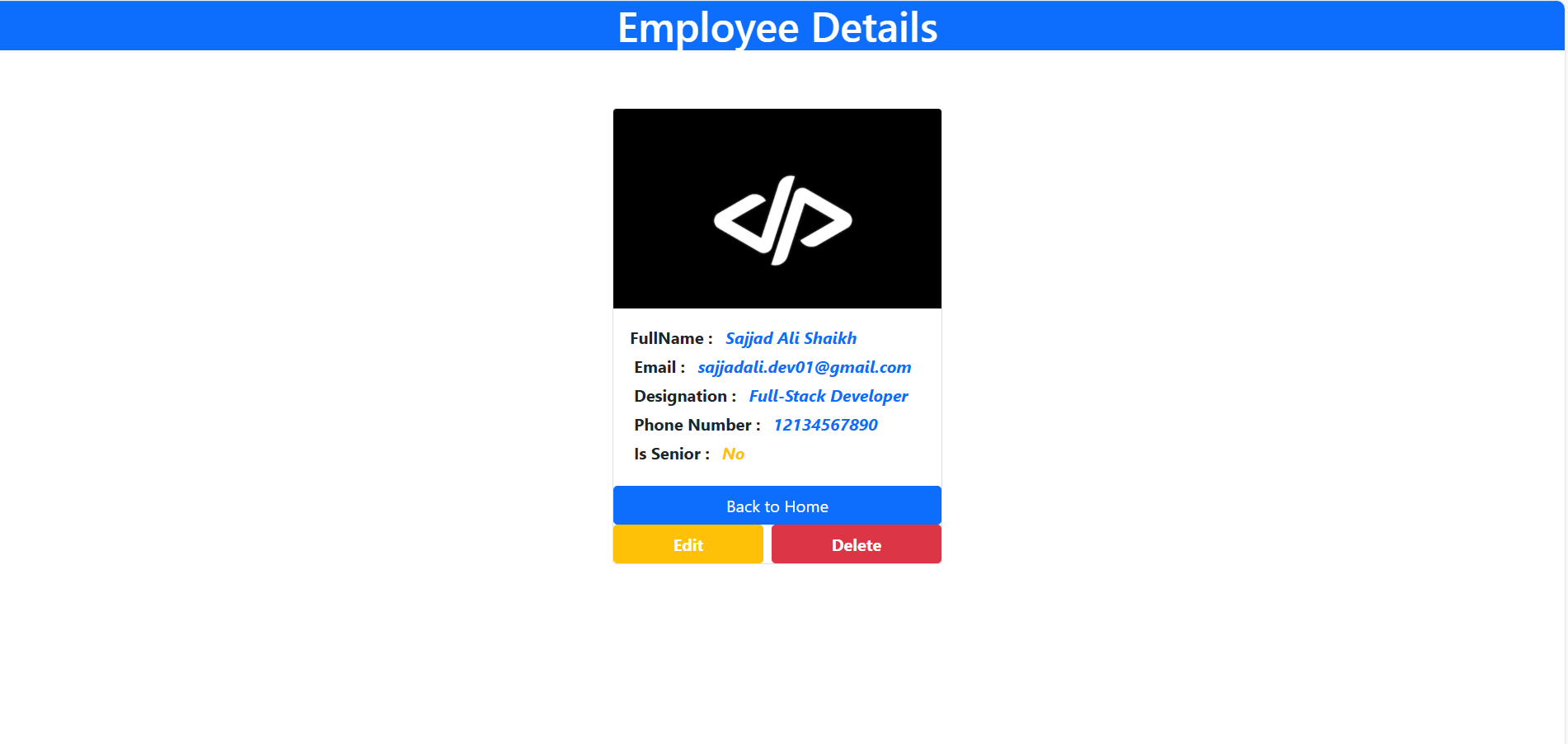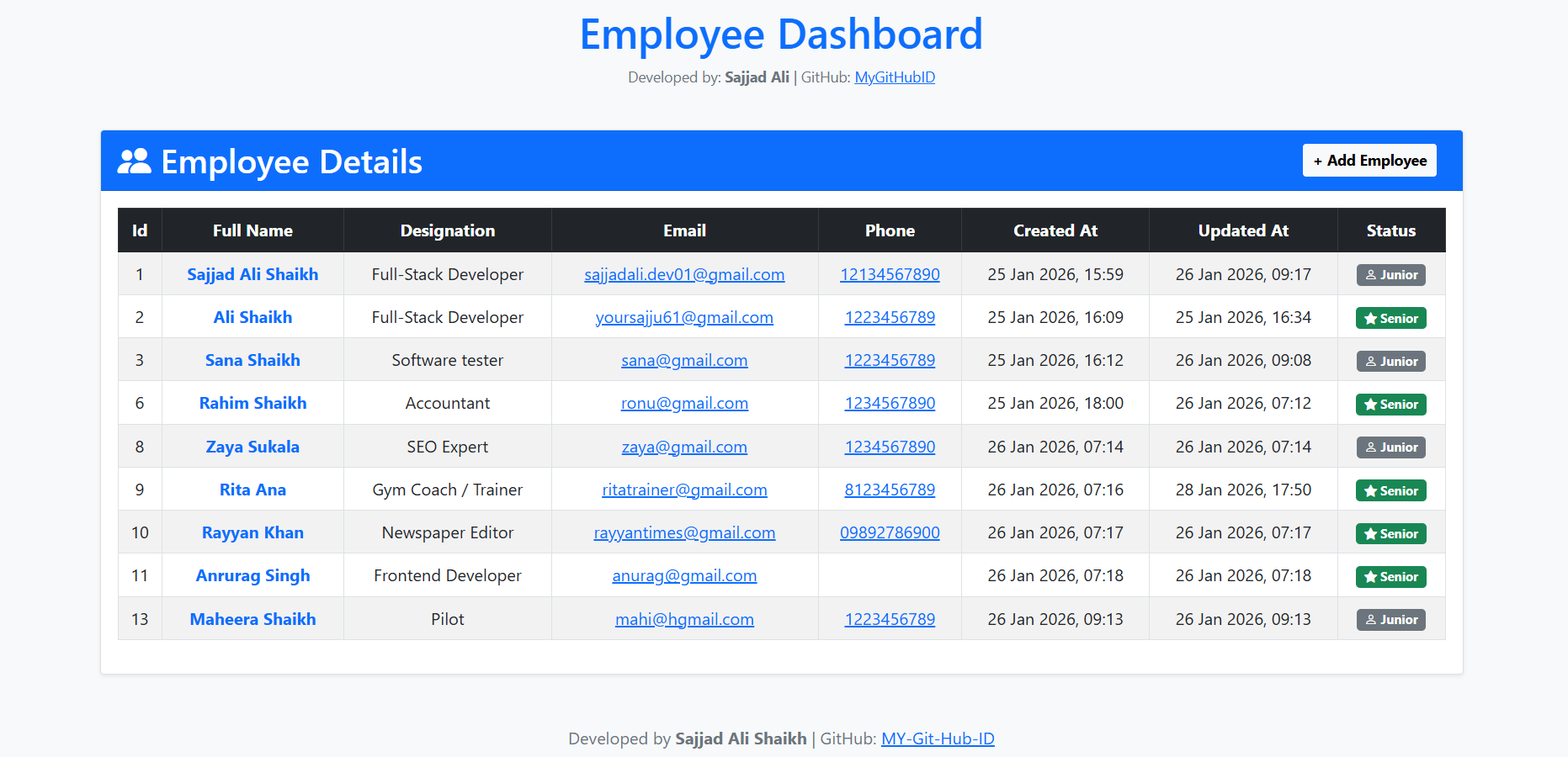 This project allows admins to manage employee records including personal details, designation, contact info, and profile photos.