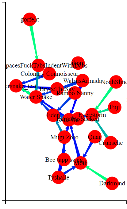 The list of all users with interactions on the server is kept as a one-hot vector. The user is treated as the label. The classifier has to use a probabilistic OneVsAll approach, giving a probability distribution over the entire user-base instead of just the top answer. Using this method across the entire userbase generates a distribution of the one-way probability of a user interacting with another user. This will generate a graph: