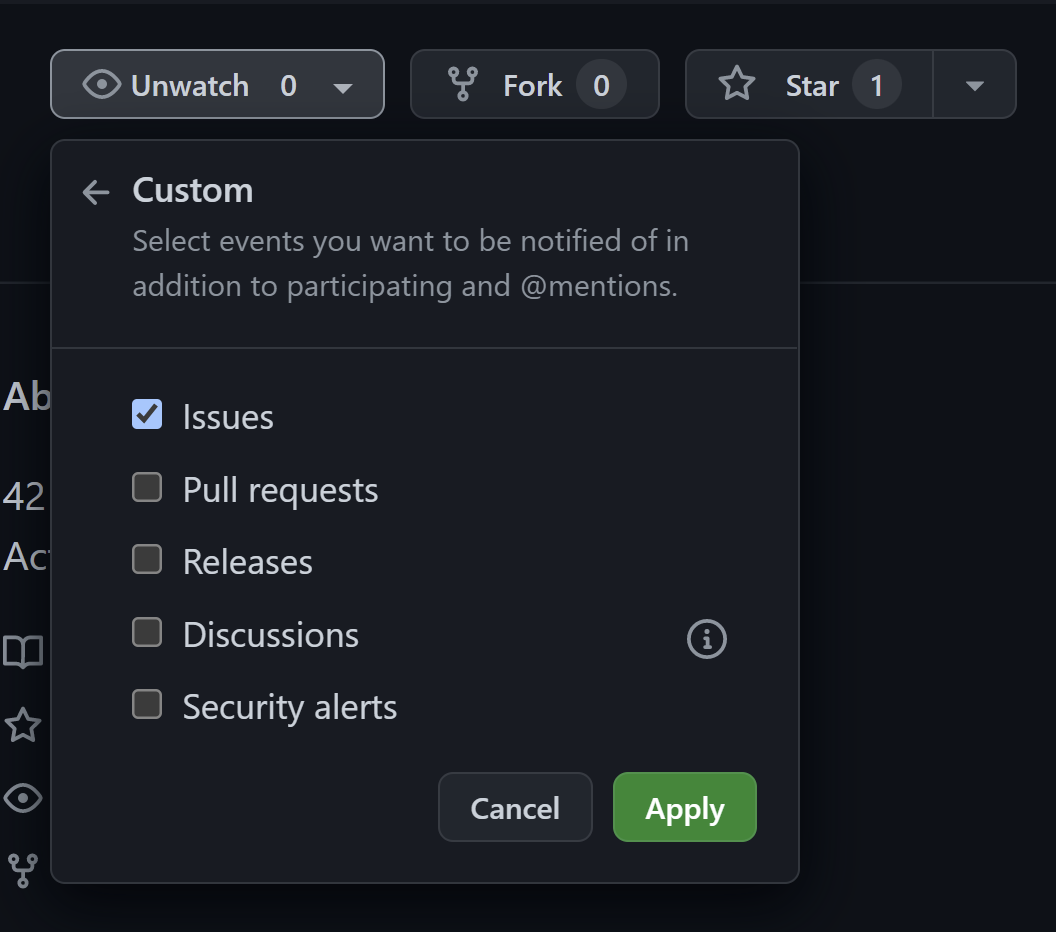 42 Event Notifier 42서울 Agenda에 새로운 이벤트가 등록되면 알려드립니다! 현재는 Github Issue로 등록되므로 상단 Issue 탭에서 확인하시거나 Watch -> Custom -> Issues 체크박스를 통해 알림을 받으실 수 있습니다. 나중에는 Slack, Discord, Telegram 등을 통해 알림을 받을 수 있도록 업데이트 할 예정입니다.
