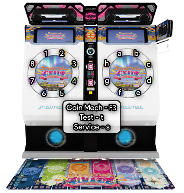 All hardware buttons including 1P, 2P, Test, Service, and Coin are mapped to keyboard keys based on the diagram below: