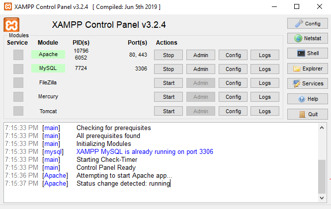 After installing Xampp. Run it and Start Apache, MySQL as in the figure below.