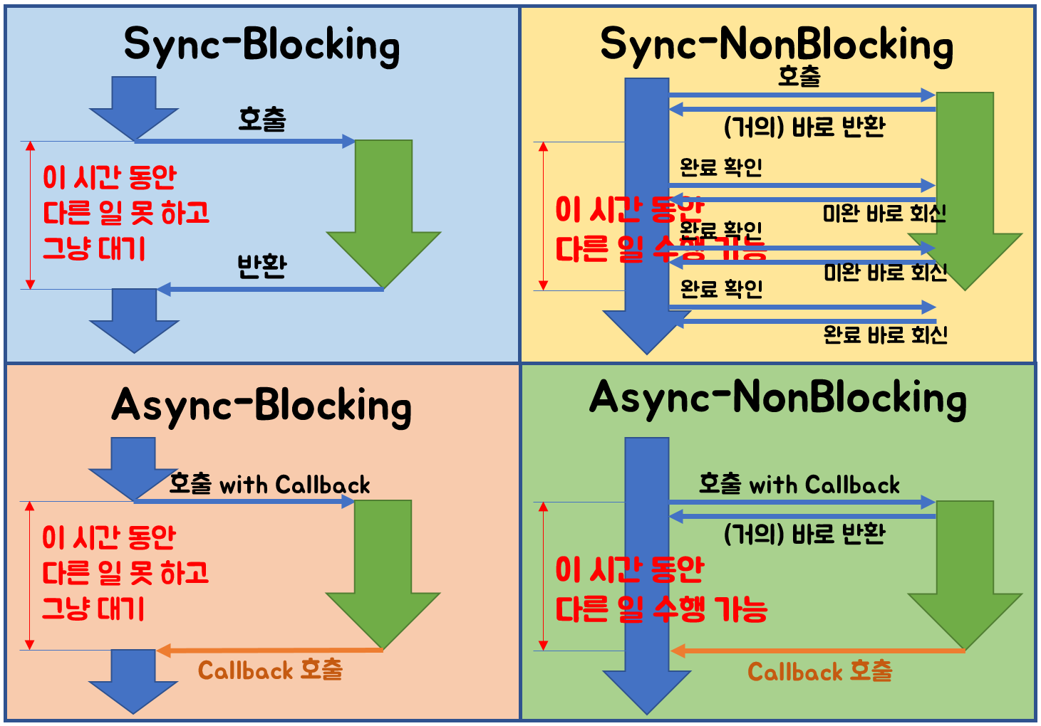 Blocking : 작업 완료 후, 반환. Non-Blocking : 작업 완료 전이더라도, 반환해 줌.