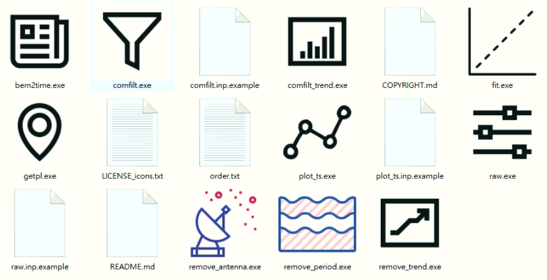 bern2time.exe(Transform Bersese 5.xFN*.OUTfile to E/N/U format plain text)raw.exe/comfilt.exeremove_trend.exeremove_period.exeremove_antenna.exefit.exe(Fit Velocity)